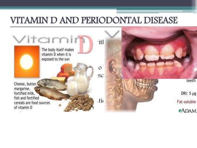 Periodontitis is a chronic inflammatory condition caused by oral microbes that, if left. An important link you may be missing Dec 1 20Vitamin D also aids in the absorption of calcium and phosphate in the teeth and bones, so Bill said if a patient is deficient in vitamin D this can have a knock on effect, with the result being periodontitis inflammation of gums and weak teeth. Vitamins That Help Periodontal Disease m Vitamin D deficiency is implicated in a number of diseases including periodontitis.